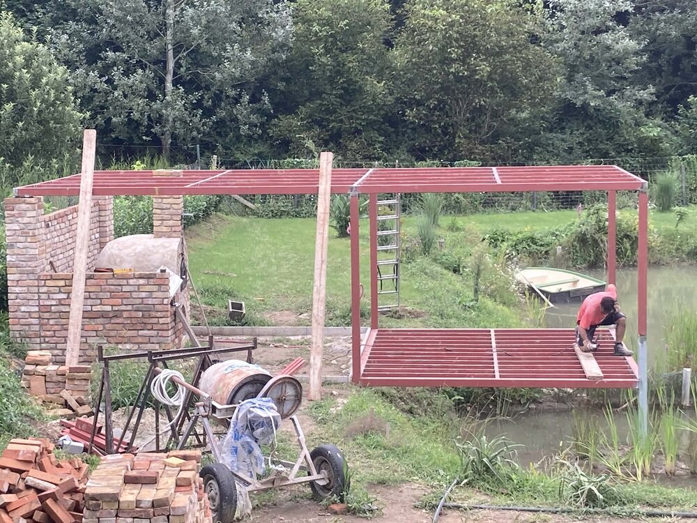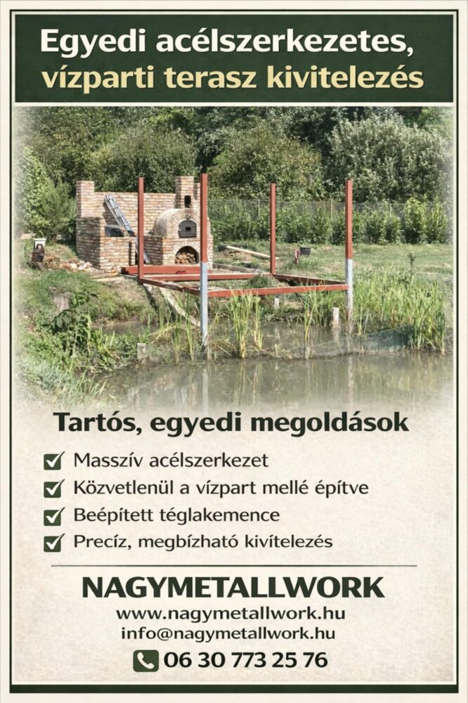 kivitelezés során egy egyedi tervezésű acélvázas teraszszerkezet készült, részben víz fölé nyúló kialakítással.