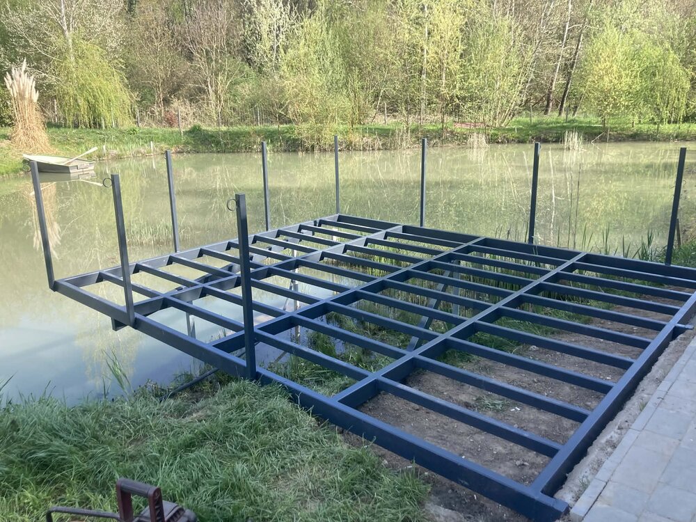 A projekt egy egyedi tervezésű acélvázas terasz, amely részben a víz fölé nyúló kialakítással készült.
